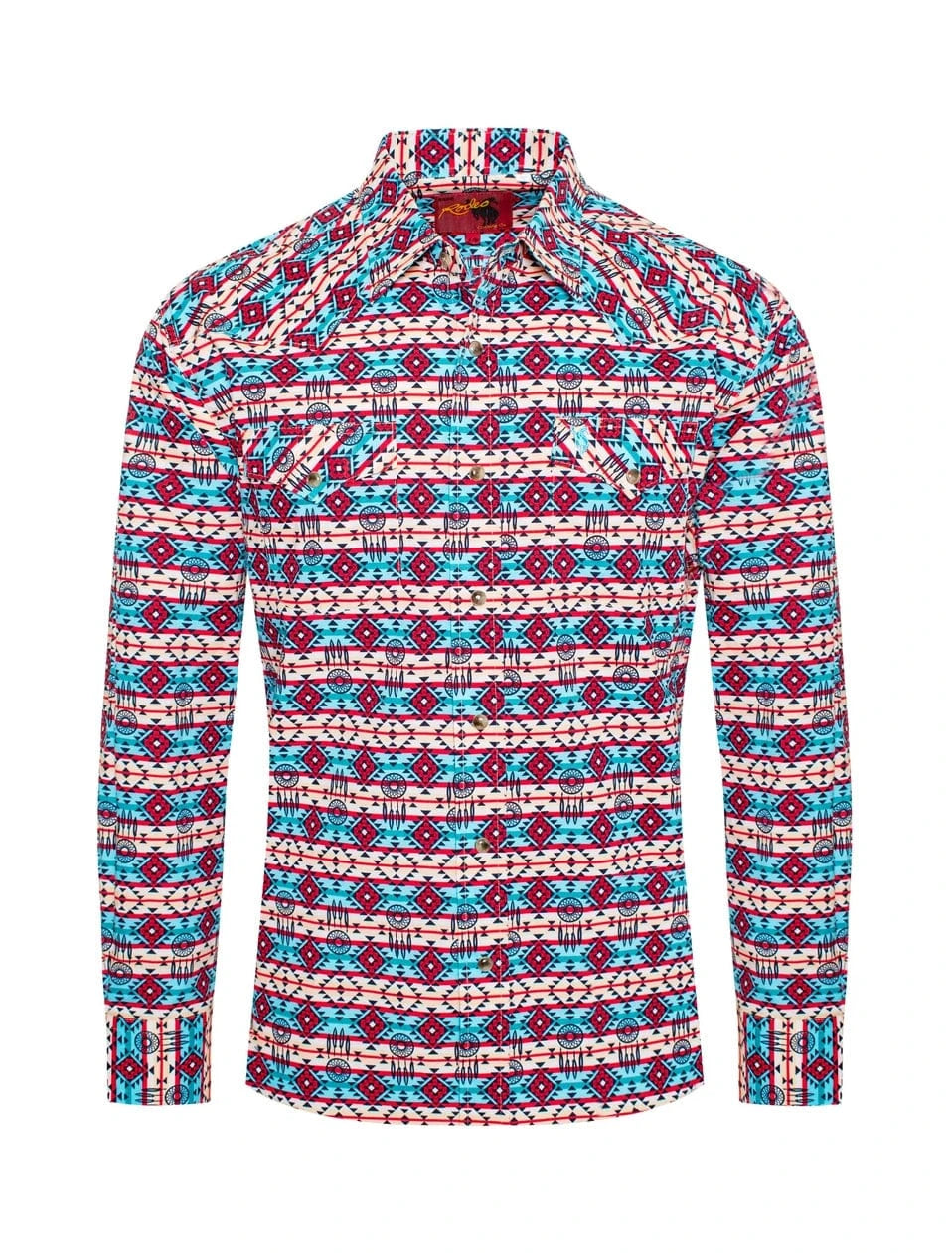 Label: RODEO CLOTHING Fabric: 100% Cotton printed fabric. Description: Men's western long sleeve, 100% cotton printed shirts with snap buttons. PATTERN: Print FABRIC TYPE: Woven COLLAR STYLE: Regular Western Collar MATERIAL:100% Cotton Poplin STYLE: Regular Fit Western Style OTHER FEATURE: * FLAP POCKET * SNAP BUTTONS * PRINTED FABRIC * CONTRAST FABRIC INSIDE COLLAR * CONTRAST FABRIC INSIDE CUFFS