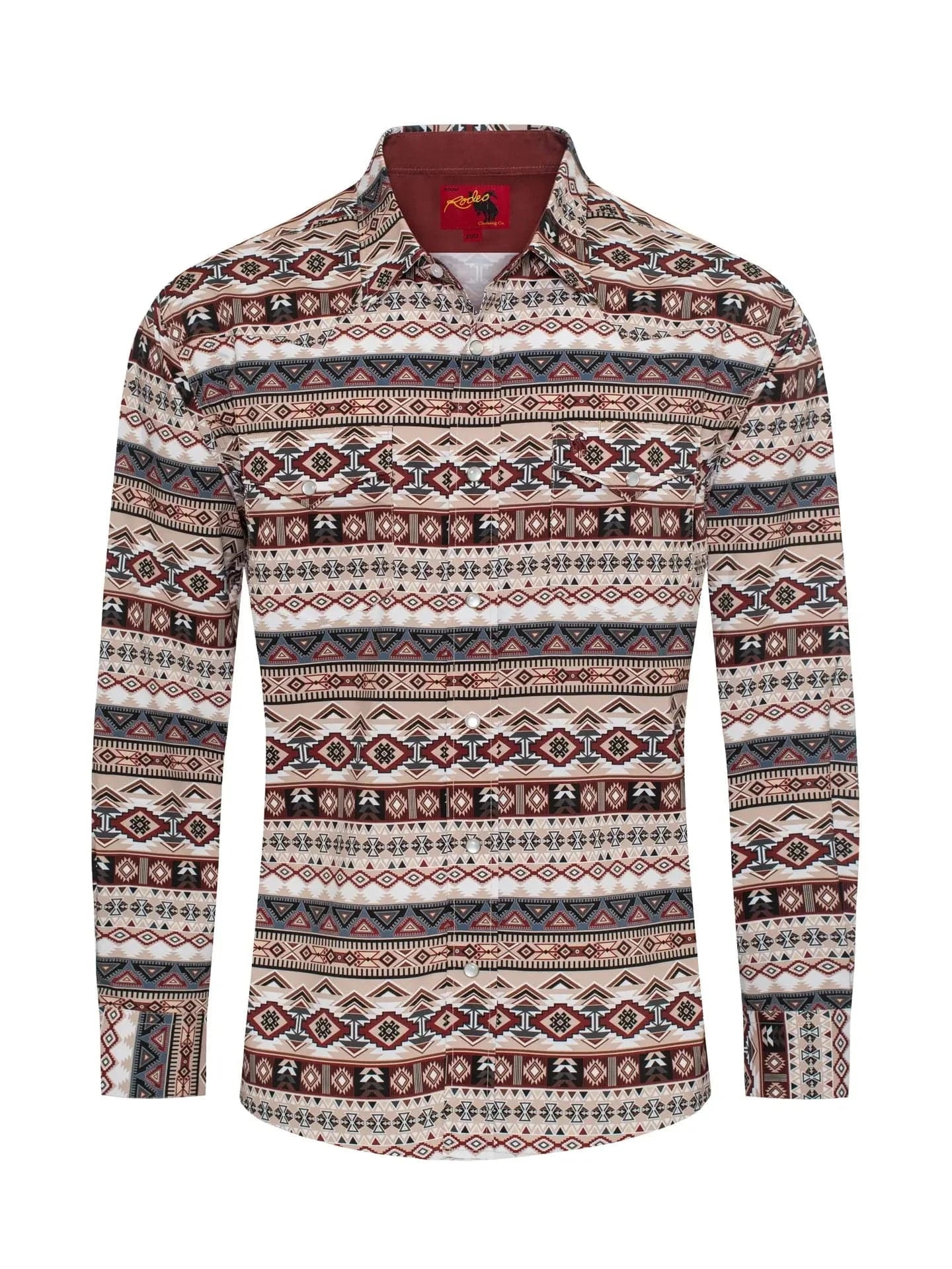 Description: Rodeo Men's western long-sleeve, 100% modal Aztec printed shirts with snap buttons. PATTERN: Aztec FABRIC TYPE: Woven COLLAR STYLE: Regular Western Collar MATERIAL: 100% Modal Modal is a semi-synthetic fabric made from cellulose from beech trees. It's a type of rayon.