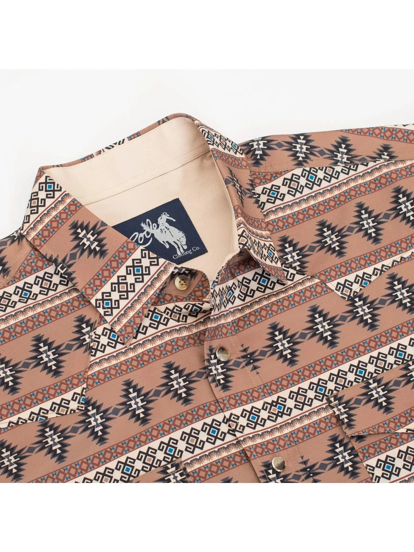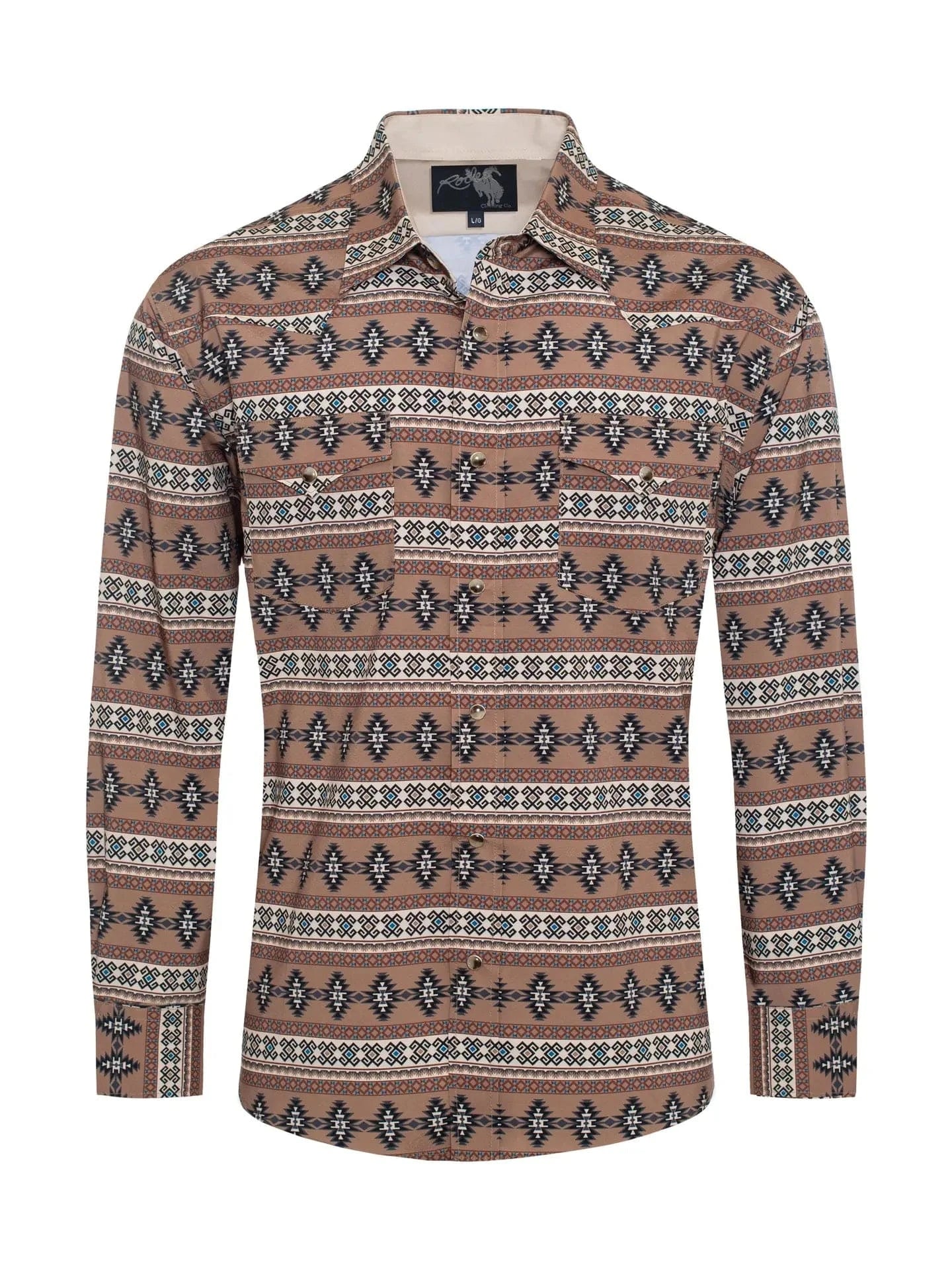 Description: Rodeo Men's western long-sleeve, 100% modal Aztec printed shirts with snap buttons. PATTERN: Aztec FABRIC TYPE: Woven COLLAR STYLE: Regular Western Collar MATERIAL: 100% Modal Modal is a semi-synthetic fabric made from cellulose from beech trees. It's a type of rayon.